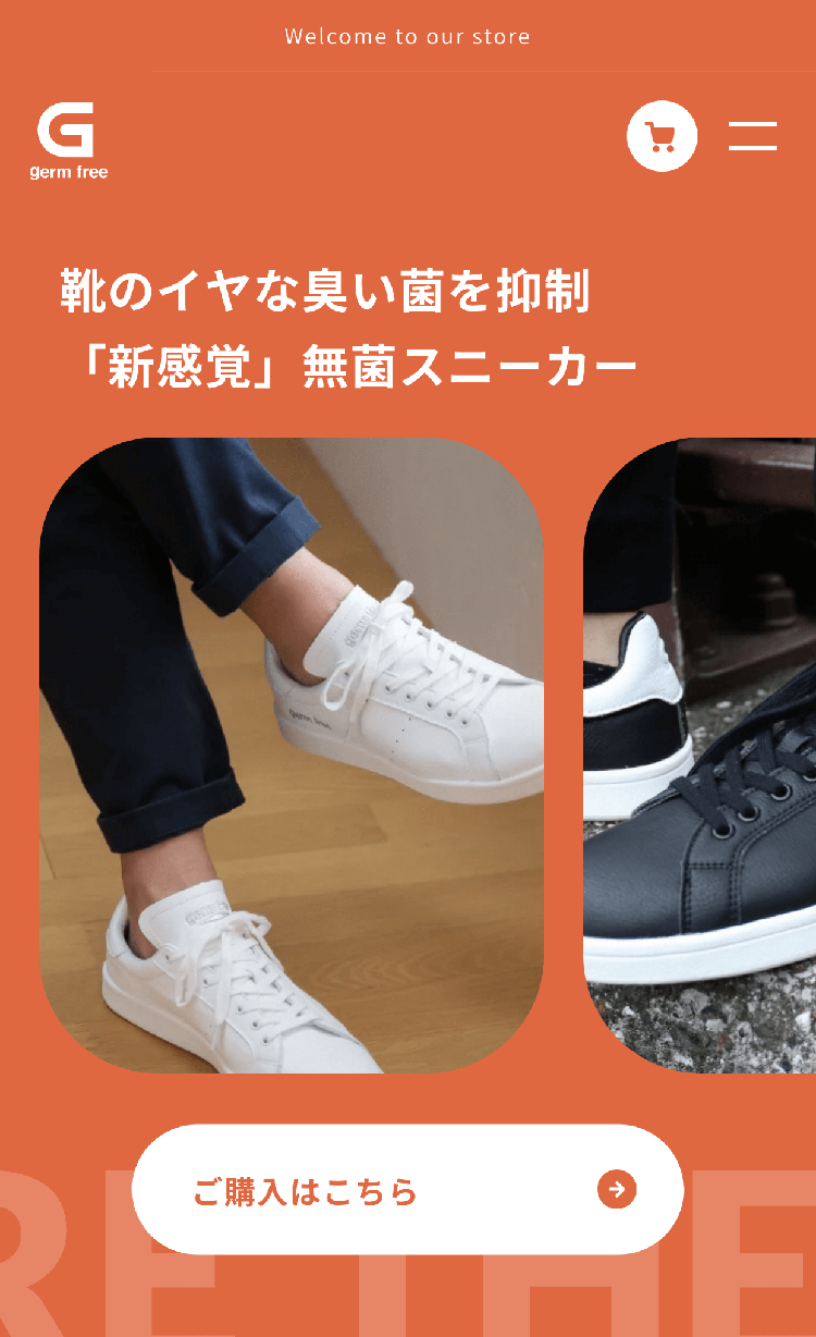 無菌・無臭スニーカーであることを分かりやすくアピールするため、機能性やお客様の声がすぐ目に入るよう、強みが分かりやすい構成にしました。