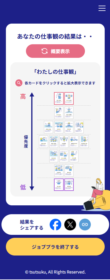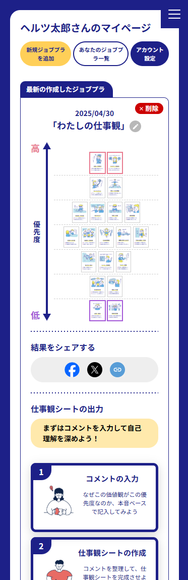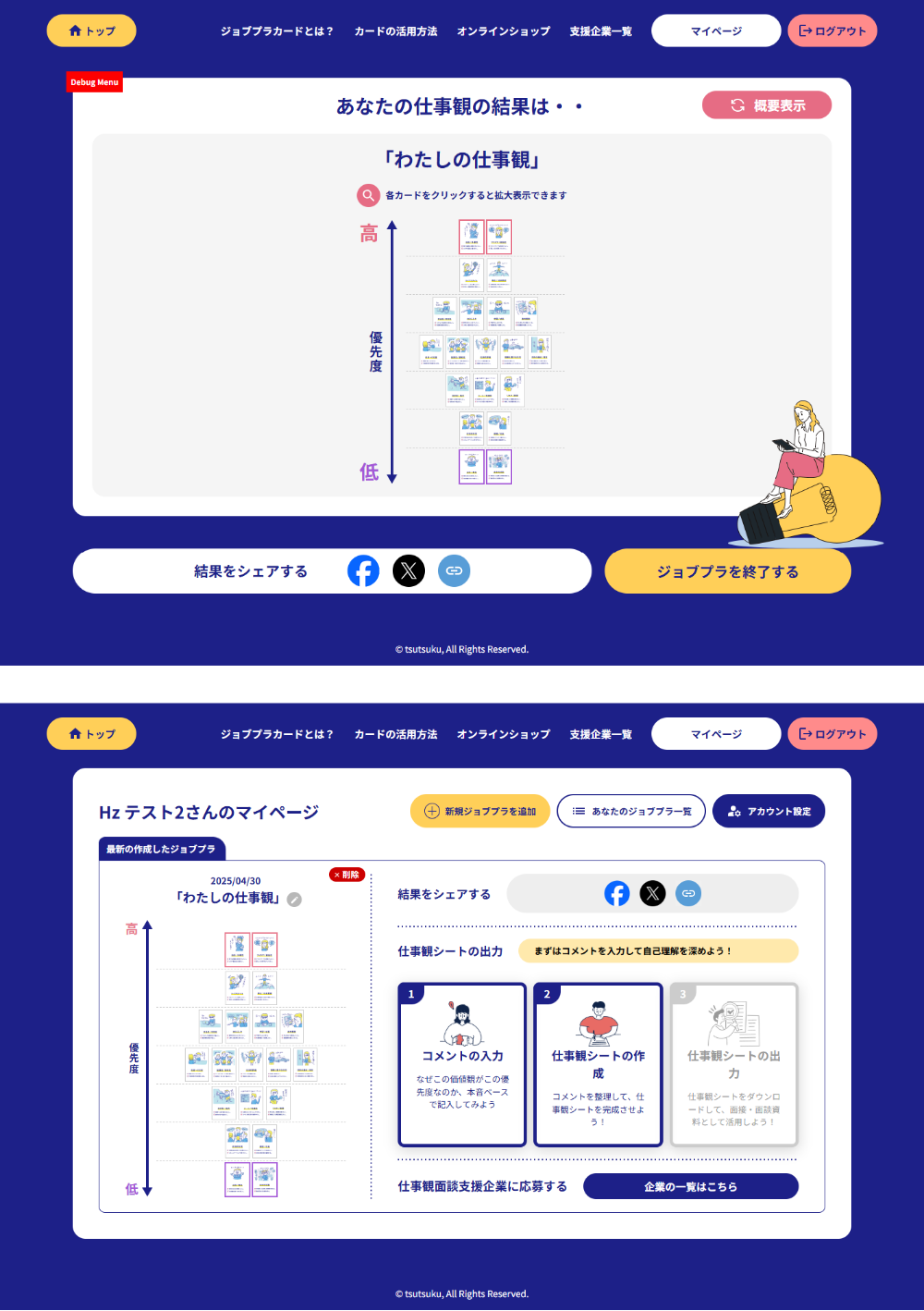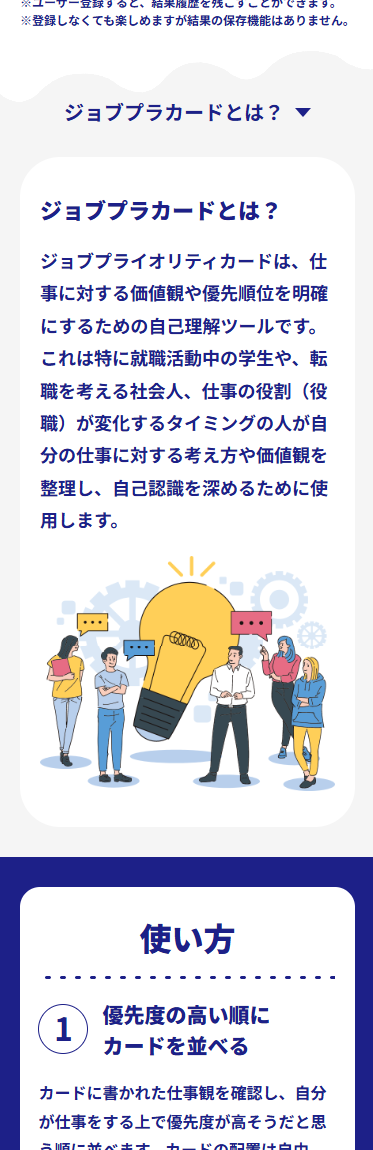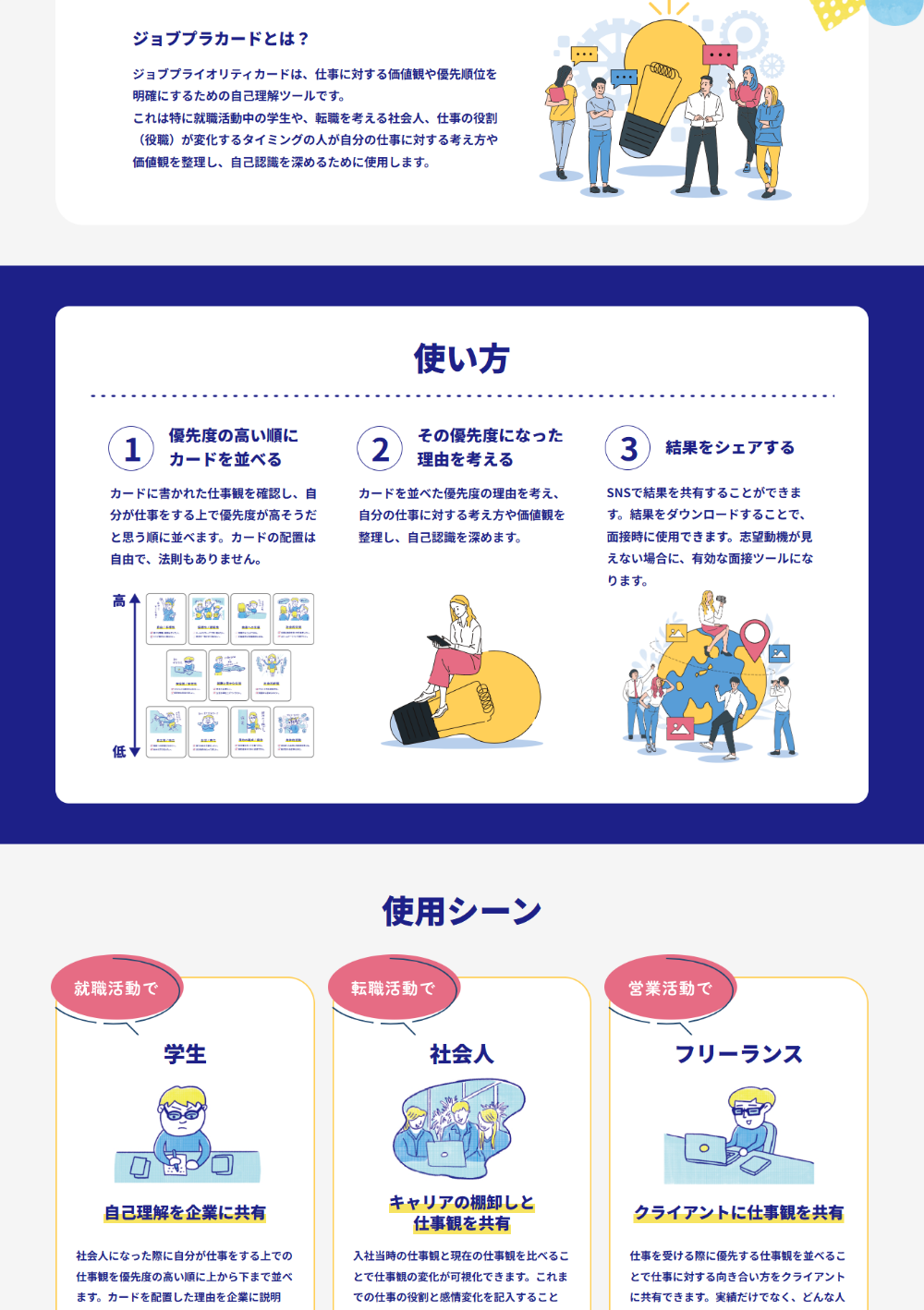 特に就職活動中の学生や、転職を考える社会人、仕事の役割(役職)が変化するタイミングの人が自分の仕事に対する考え方や価値観を整理し、自己認識を深めるために活用してもらえるサイトを目指しました。