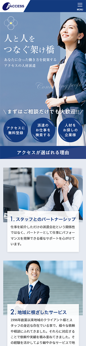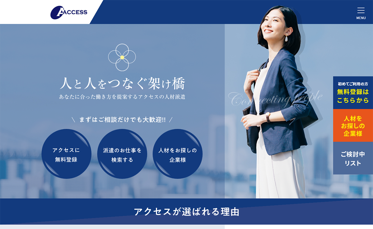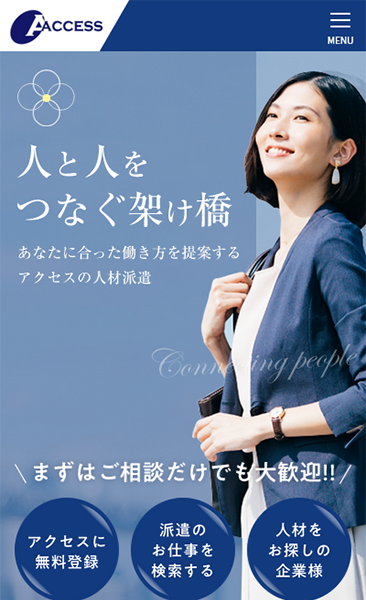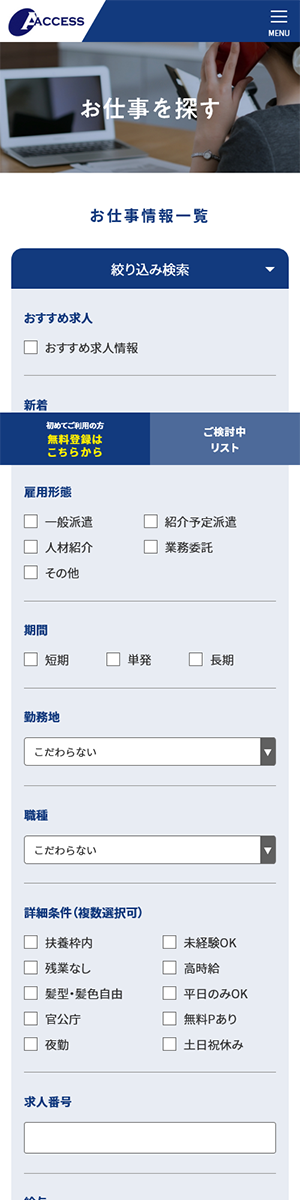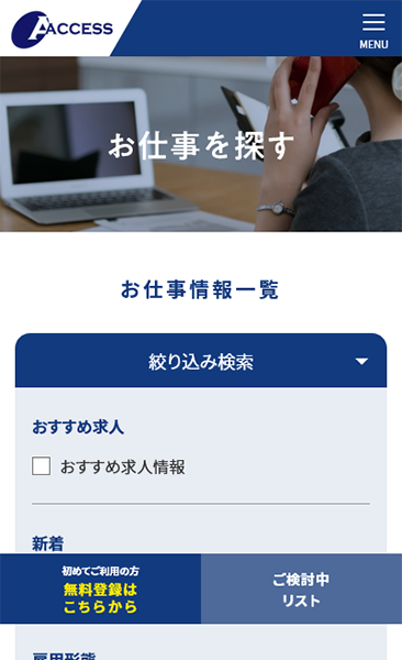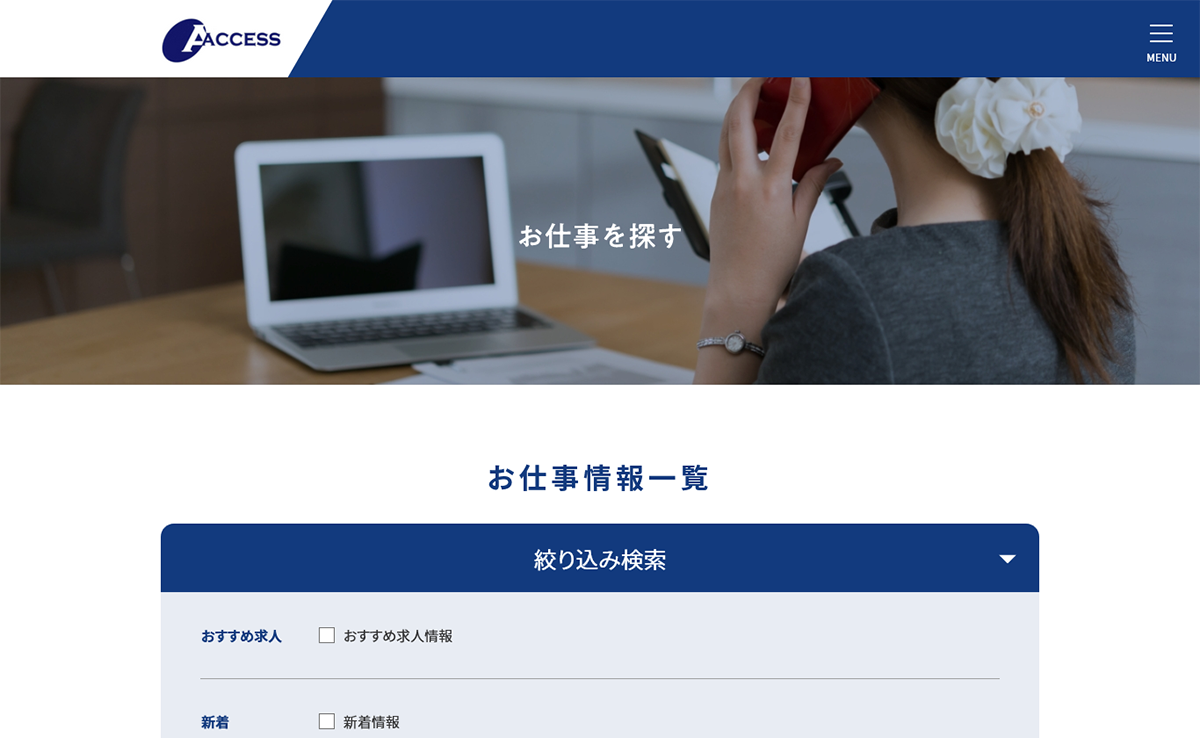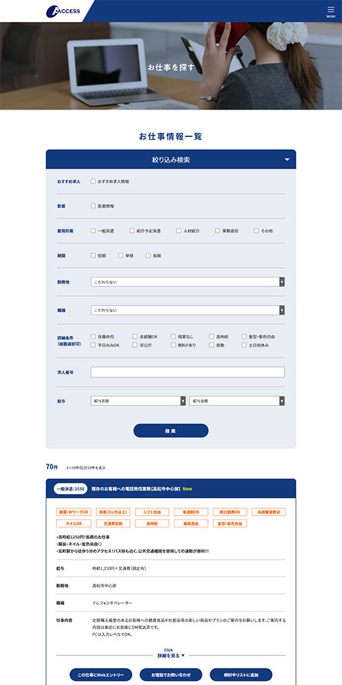 Webサイトの老朽化によりデザインの刷新、派遣登録者向け求人情報の向上、自社での求人情報の登録作業の円滑化をご希望されており数回のお打ち合わせを経て要望等をヒアリングし、Webサイトを完成させました。