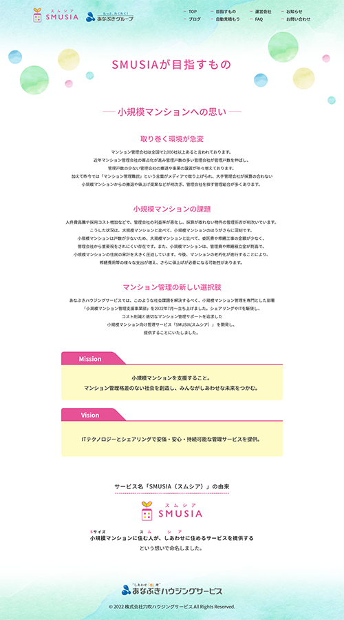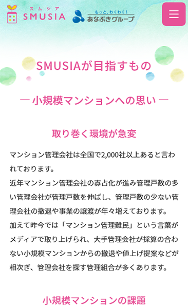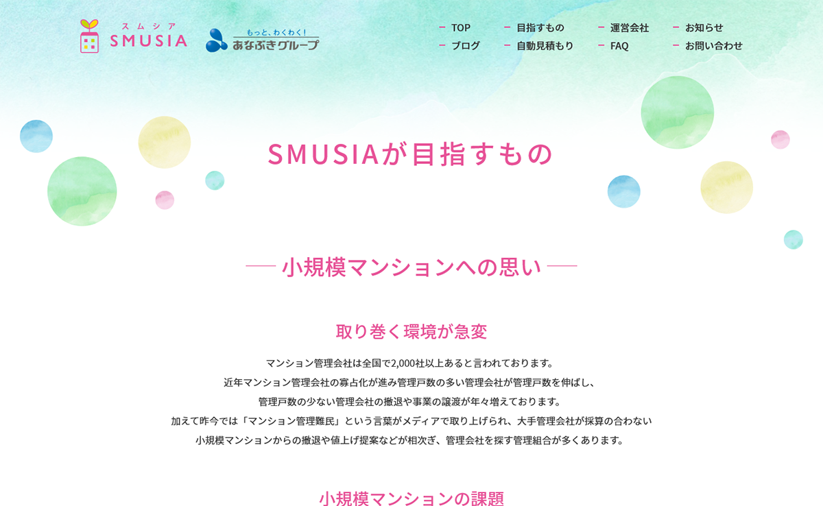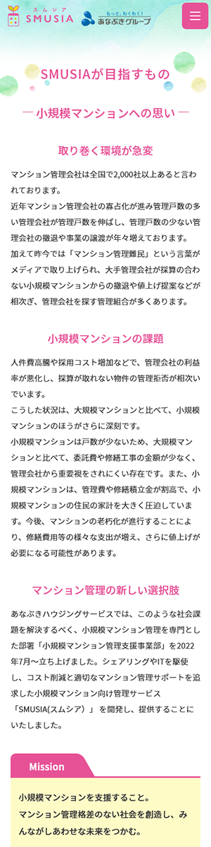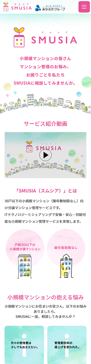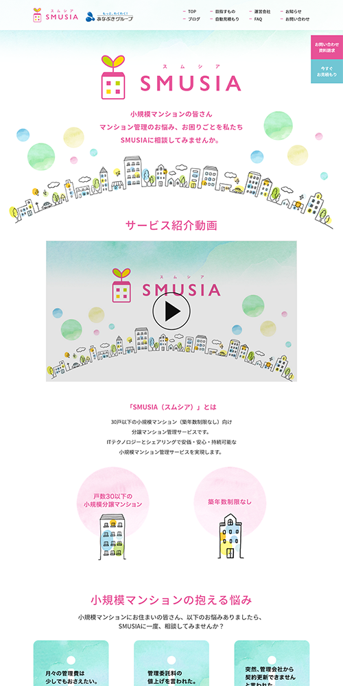 株式会社穴吹ハウジングサービスより新規事業立ち上げによるランディングページ 制作のご依頼をいただきました。30戸以下の小規模マンション向けの管理サービスの紹介ページとなります。打ち合わせを複数回行い、ご要望や戦略等をお伺いしながらサイト構築をさせていただきました。