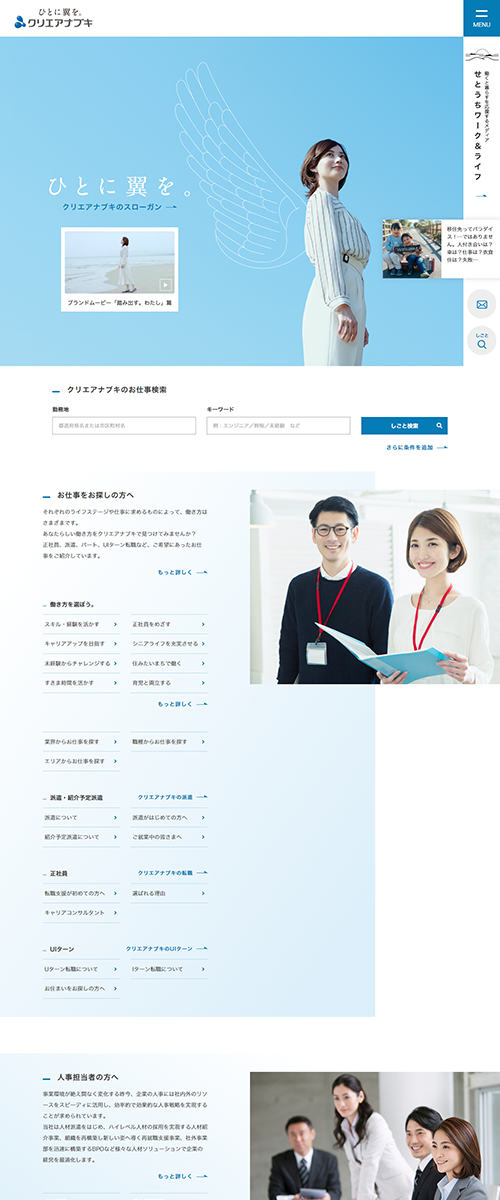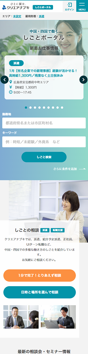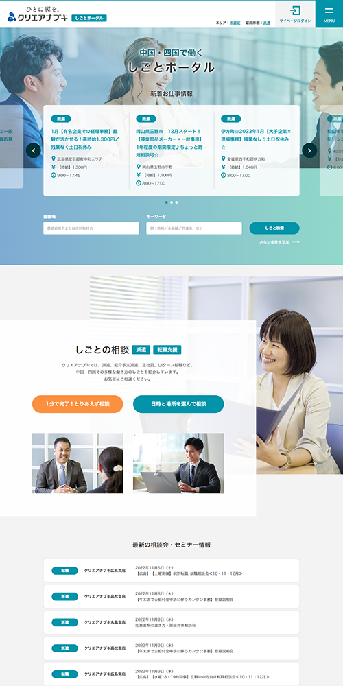 香川県高松市にある人材派遣企業のリニューアル案件。別ドメインで展開していた派遣・転職のサイトを合体させ、働き方の垣根を超えた自由度の高い求人検索を実現するシステムを実装しました。また、仕事に関するコラムを掲載するメディアサイトも同時に立ち上げ、仕事に関する情報を発信しております。