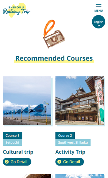 旅行を促すサイトなので四国の風景写真をキレイに見せることは大前提として、旅行を楽しんでいる雰囲気や四国らしいアイテムのイラスと写真と組み合わせて親しみやすくおしゃれな雰囲気を演出。