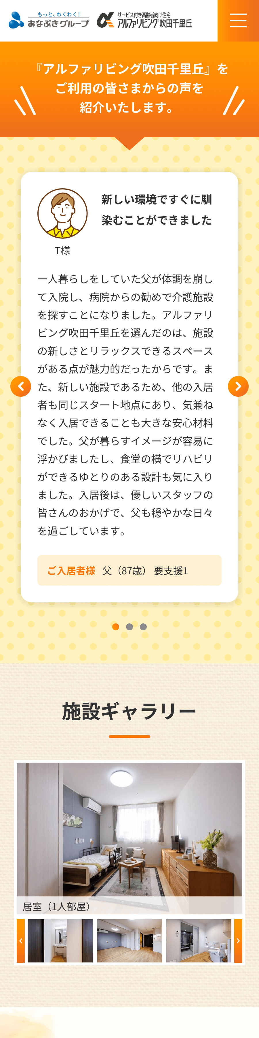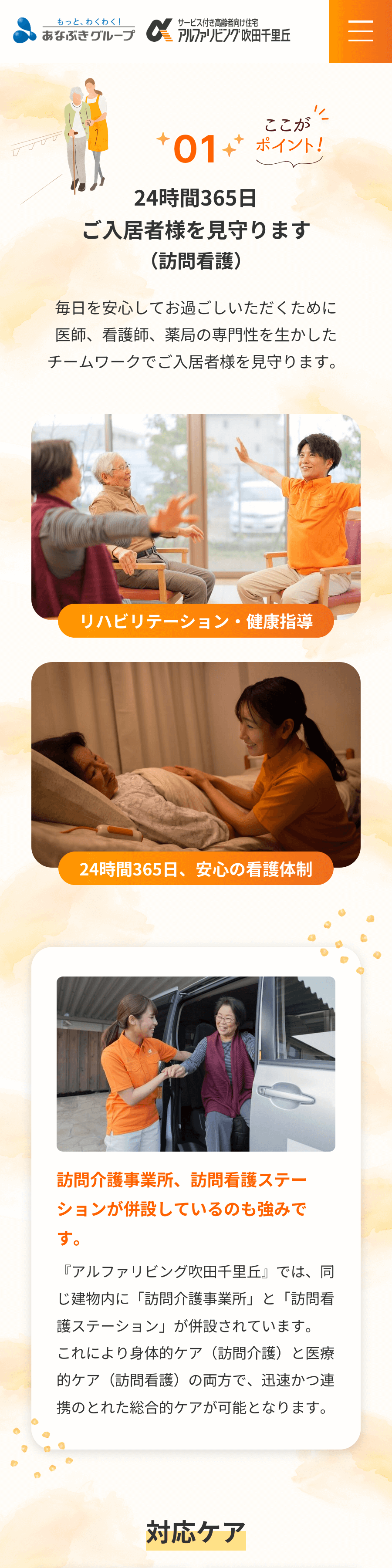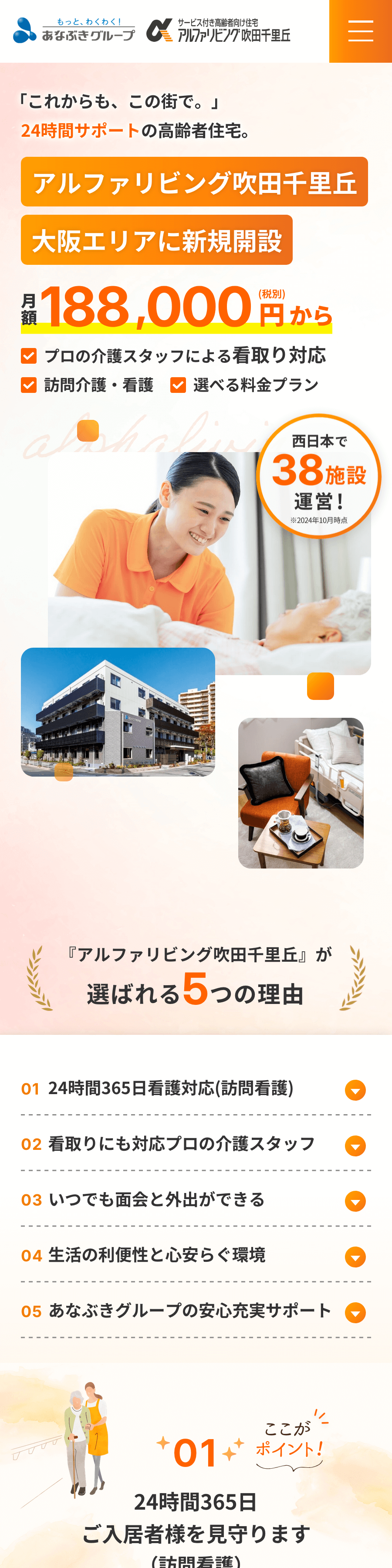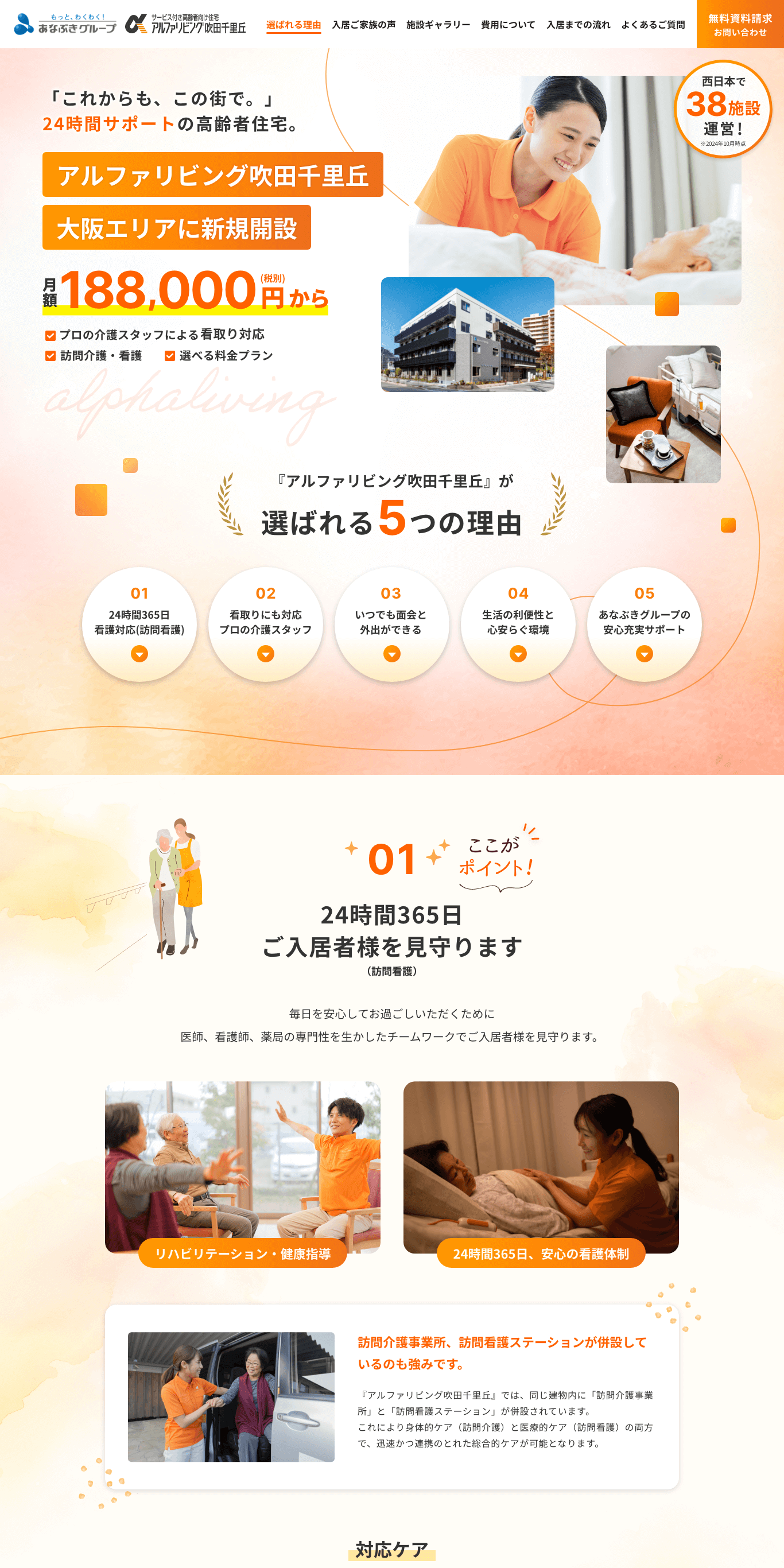 大阪・吹田市に新たに開設された、安心と快適さを追求したサービス付き高齢者向け住宅「アルファリビング吹田千里丘」のランディングページ制作を担当させていただきました。