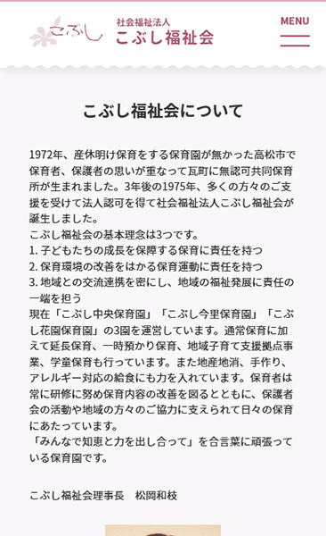 サイトの老朽化によるデザインの刷新とスマートホン対応を実施したいとのことでご依頼をいただきました。各保育園4サイトの同時公開で対応いたしました。