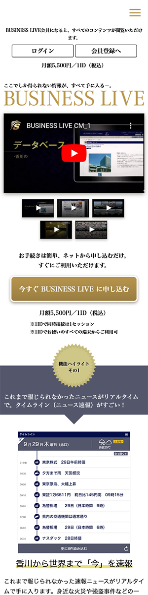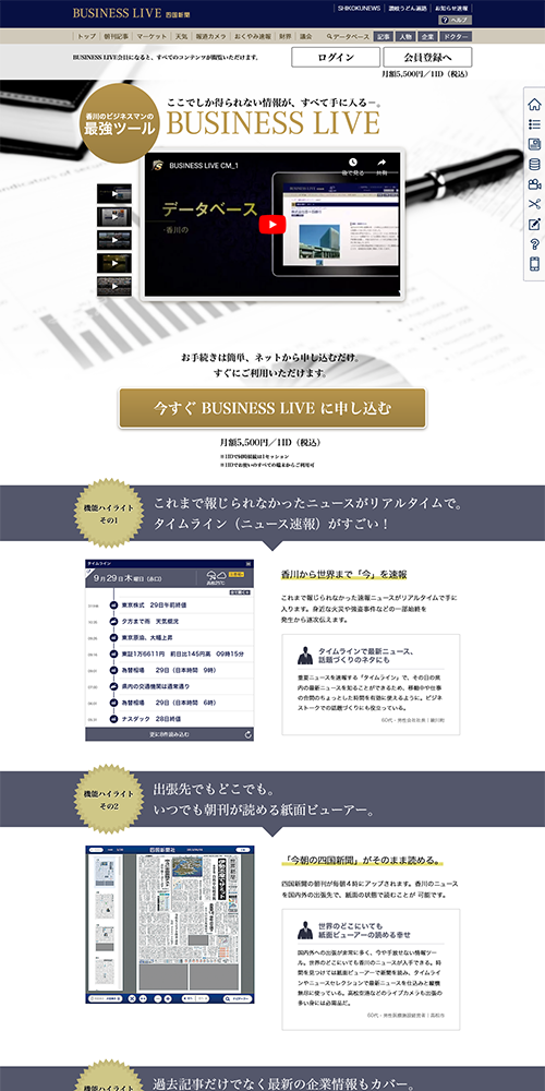 四国新聞社が提供するビジネスマン向け情報サービス「BUSINESS LIVE」のサイト。機能のハイライトを分かりやすくデザインしました。